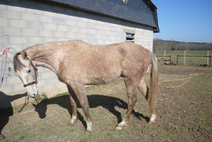 - ALFA SF par Poor Boy x Enchanteur AA, 15 ans, 1m63, dite JUNIOR puisqu'elle a le même nom que sa mère. Testée saine à la PSSM.