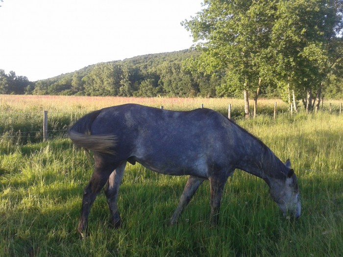 - ALFA SF par Poor Boy x Enchanteur AA, 15 ans, 1m63, dite JUNIOR puisqu'elle a le même nom que sa mère. Testée saine à la PSSM.
