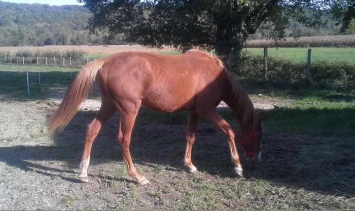 - ALFA SF par Poor Boy x Enchanteur AA, 15 ans, 1m63, dite JUNIOR puisqu'elle a le même nom que sa mère. Testée saine à la PSSM.