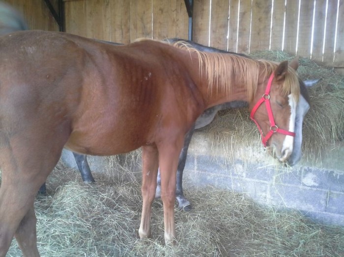 Je suis sûre qu'il va vite reprendre avec tout le foin qu'il a disposition + de vraies rations. Je n'imagine même pas l'état de la jument qui l'a nourri 18 mois, enfin ce n'était sûrement pas du luxe pour D'gin.