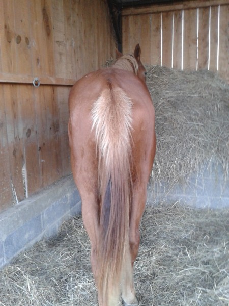 - ALFA SF par Poor Boy x Enchanteur AA, 15 ans, 1m63, dite JUNIOR puisqu'elle a le même nom que sa mère. Testée saine à la PSSM.