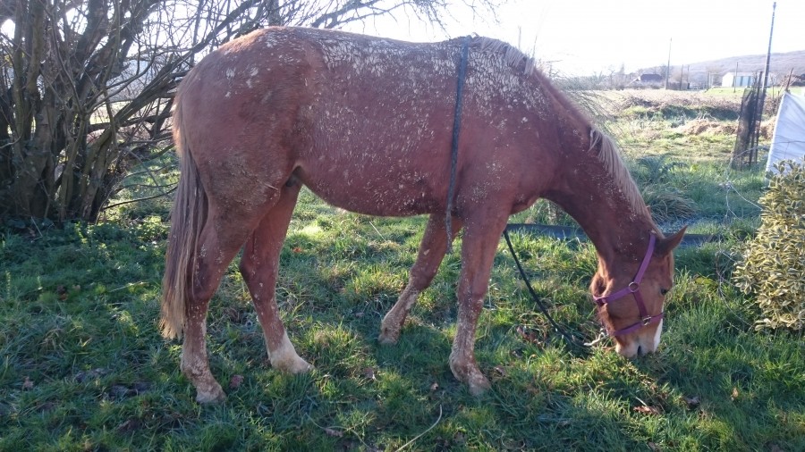 - ALFA SF par Poor Boy x Enchanteur AA, 15 ans, 1m63, dite JUNIOR puisqu'elle a le même nom que sa mère. Testée saine à la PSSM.