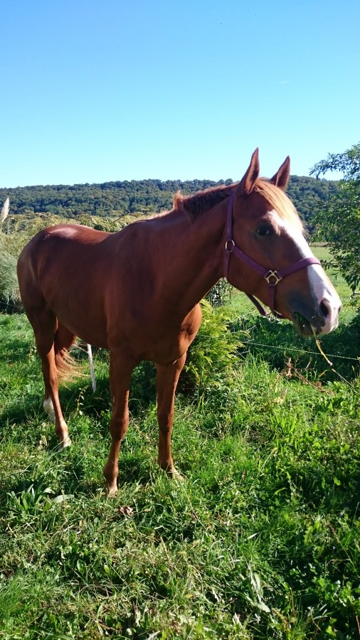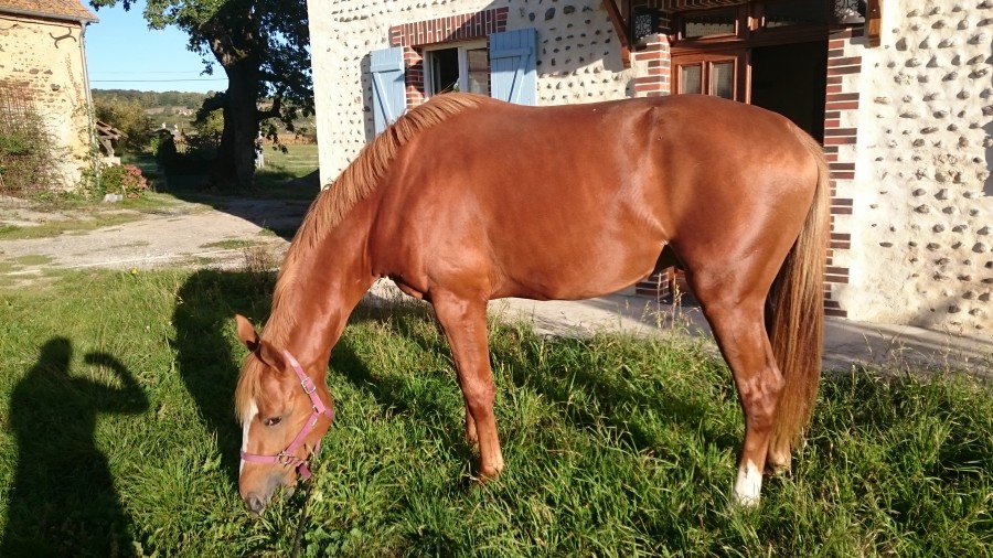 - ALFA SF par Poor Boy x Enchanteur AA, 15 ans, 1m63, dite JUNIOR puisqu'elle a le même nom que sa mère. Testée saine à la PSSM.