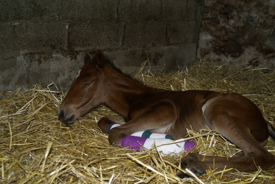 Voilà mon poulain du jour, qui ne commence pas super bien dans la vie! Il est bouleté des antérieurs donc le véto a fait un gros bandage qui fait office d'attelle. Pour l'instant, le poulain n'arrive pas à tenir debout, il ne peut donc pas téter et il faut donc lui faire des biberons régulièrement. Des volontaires pour cette nuit?