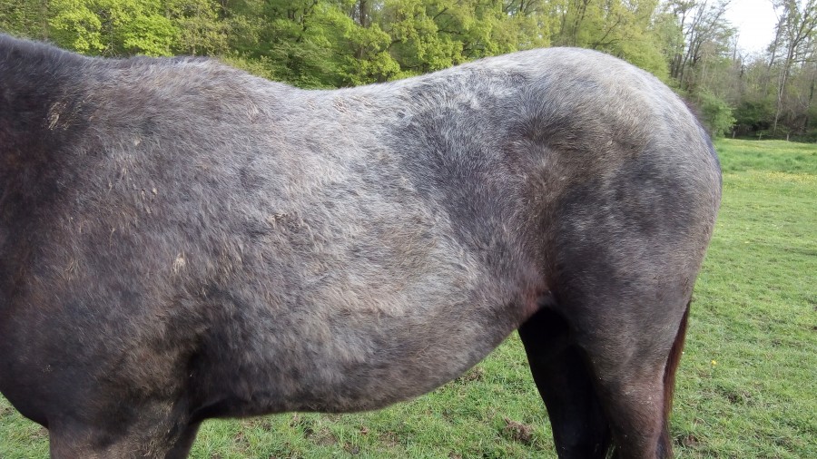 Moi j'ai Alfa qui a quelques poils blancs sur les flancs: ça ne se voit pas en hiver mais en ce moment si. Il n'y a pas du tout de gris dans la famille mais la grand-mère était aubère, je pense que les poils blancs viennent d'elle: ils en ont quasiment tous dans la famille, et ils ont tous une robe bien plus claire en été qu'en hiver (poils blancs obligent à mon avis)
