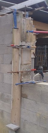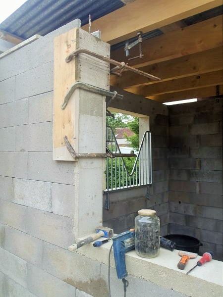 Les travaux du jour : coffrage et coulée des tableaux des ouvertures du boxe de poulinage.