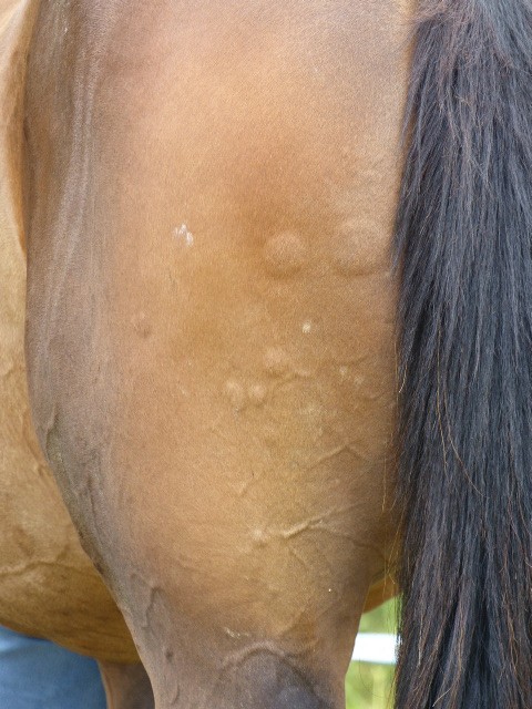 Zazou est tout moche du poitrail aussi , les moucherons l'embetent , elle fait de fortes reactions aux piquires Ebene , vous avez bcp de moustiques? Jazz a l'encolure toute boutonneuse cette année c'est la fete du moustique ici