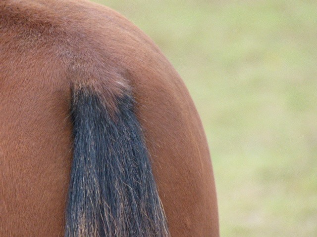 Vues les plaques sans poils qu'elle a toujours sur la tête et l'encolure depuis son retour du haras, il me dit qu'elle se gratte parce qu'elle a des poux..... Ca avait partiellement repoussé mais ça migre vers la queue, endroit typique selon lui...