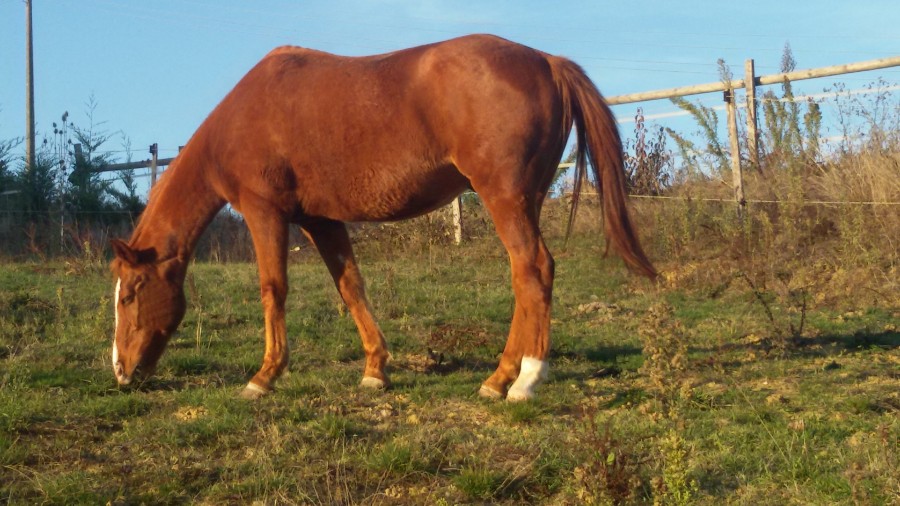 - ALFA SF par Poor Boy x Enchanteur AA, 15 ans, 1m63, dite JUNIOR puisqu'elle a le même nom que sa mère. Testée saine à la PSSM.
