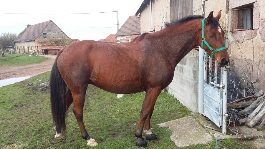 - ALFA SF par Poor Boy x Enchanteur AA, 15 ans, 1m63, dite JUNIOR puisqu'elle a le même nom que sa mère. Testée saine à la PSSM.