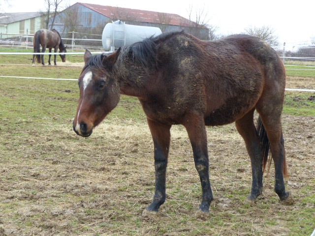 ALFA SF par Poor Boy x Enchanteur AA, 15 ans, 1m63, dite JUNIOR puisqu'elle a le même nom que sa mère. Testée saine à la PSSM.