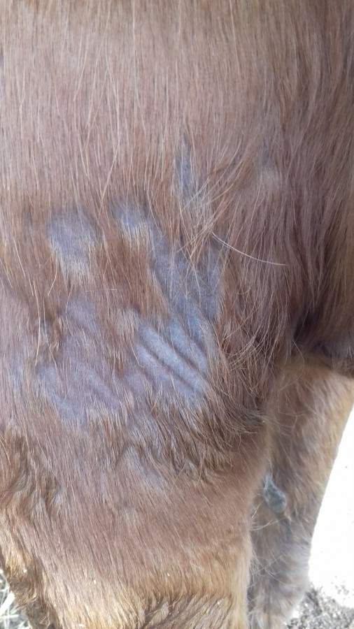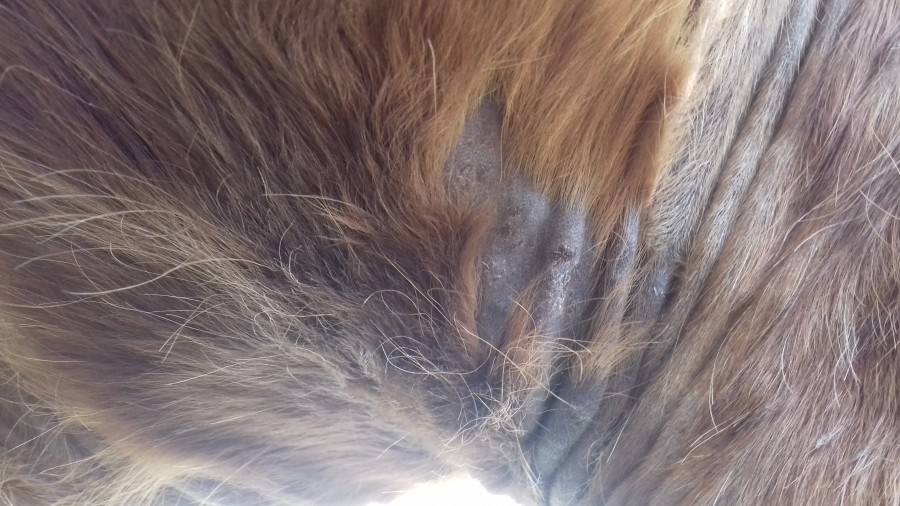 Urano, le cheval de Chéri, a un peu ça aussi en haut de l'encolure. Bon, il est en pleine mue et passe son temps à se gratter aux arbres du pré aussi donc ça n'arrange rien. D'ailleurs, les pauvres arbres n'ont plus un pet d'écorce à hauteur des chevaux.. Ils se retrouvent tous nus à force d'être utilisés comme grattoir