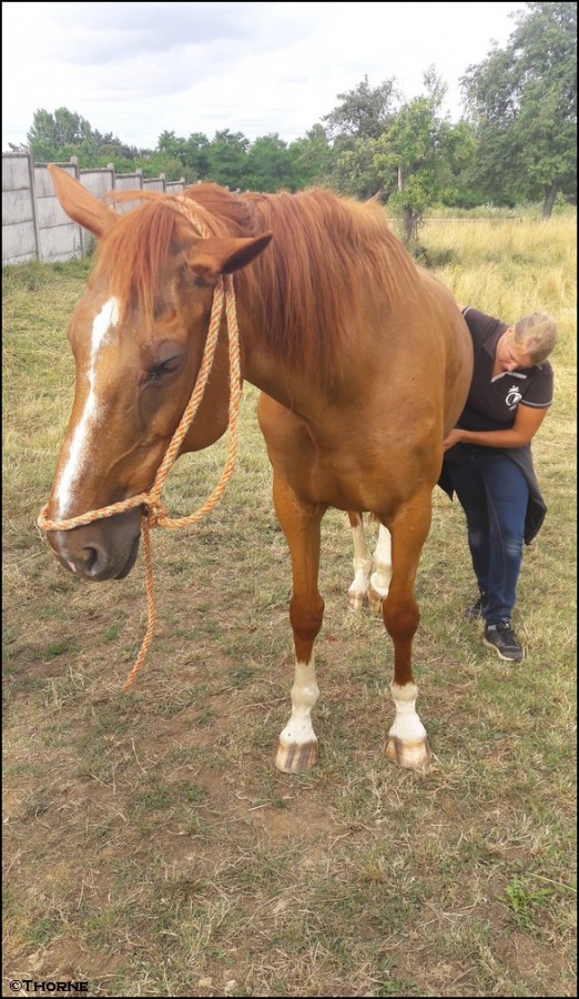 Pour le shiatsu séance jeudi soir, j'ai fait passé les deux juments , autant Lilou a kiffé mais comme n'importe quel bête pansage ( d'après la "shiatsuseuse" elle n'avait pas plus de blocages que ça, juste quelques contractures musculaires ) autant Nikita a réagit très fort en début de séances, tournant la tête au moins a 20 reprises avec un air menaçant comme pour chasser un cheval, tandis qu'elle "intervenait" sur le dos et les reins, alors que par la suite totalement endormie c'était assez impressionnant ce passage là oO , d'autant que ce n'est pas la "masseuse" (je sais definitivement pas comment les appeler lol) qui a attiré mon attention dessus, on papotais pendant qu'elle apposait ses mains,ce n'est pas elle qui a attiré mon attention dessus même si après coup j'ai bien remarqué quelle était attentive aux réactions de la jument, c'est vraiment moi qui au bout de la 4e/5e mimique ai réalisé que c'était trop excessif pour un simple chassage de taons par ex. Donc bon, à voir, de base suis plutot cartésienne, sans être fermée fermée non plus mais j'avoue que je suis toujours un peu méfiante des "nouvelles" pratiques/de l'impalpable ... mais je dois avouer que le comportement de Nikita m'a intrigué, donc si daventure ça fonctionne pour les 2 ...je crois que je serai convaincue lol