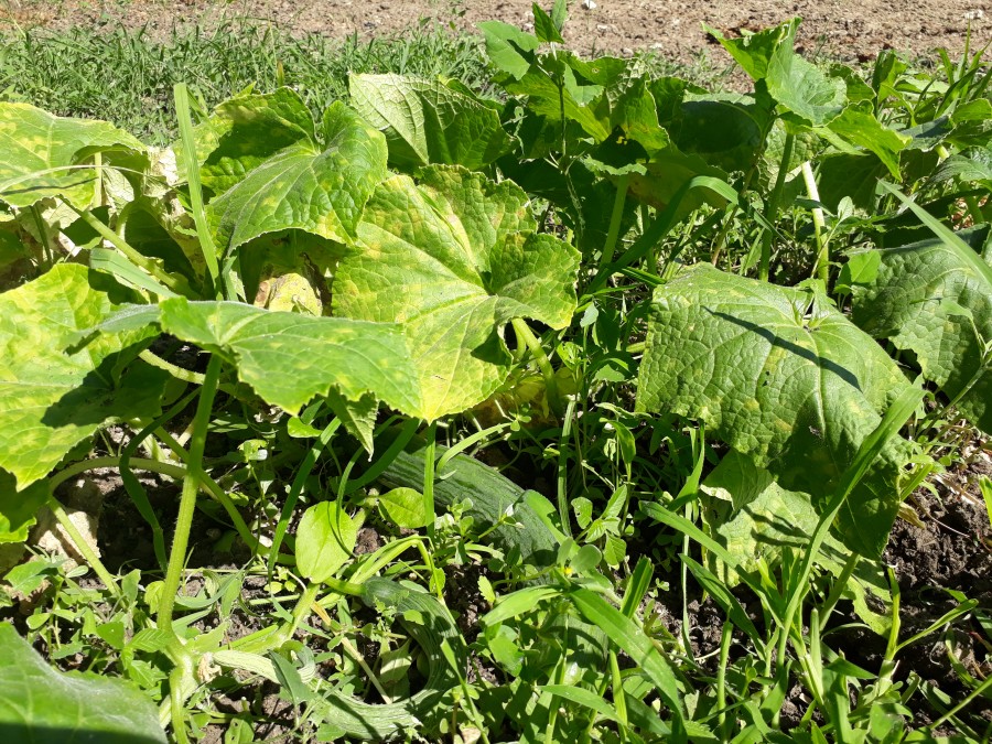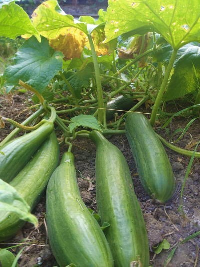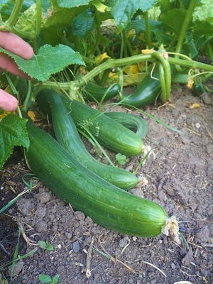 J'ai planté les 4 pieds voici 6 semaines (après les Saints de glace). J'avais retourné le potager au rotovator (pratique : 1m20 de large sur 0m20 de profondeur, 2 aller-retour au tracteur, 5mn chrono) 1 mois avant pour enfouir la verdure. Pas d'engrais, seulement l'épandage régulier des cendres de l'insert pendant l'hiver (une partie s'envole avec le vent, une partie percole avec la flotte). En revanche, je fais tourner les cultures : précédemment, c'était oignons- échalottes et encore avant, tomates. Arrosage matin et soir à l'eau de pluie (citerne de 10 000 L alimentée par une petite moitié du toit des écuries). J'ai en moyenne 6 à 8 concombres par pied, mais des fleurs éclosent encore sur les dernières ramifications.