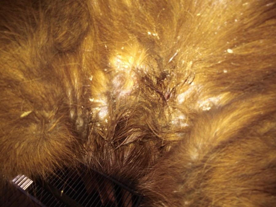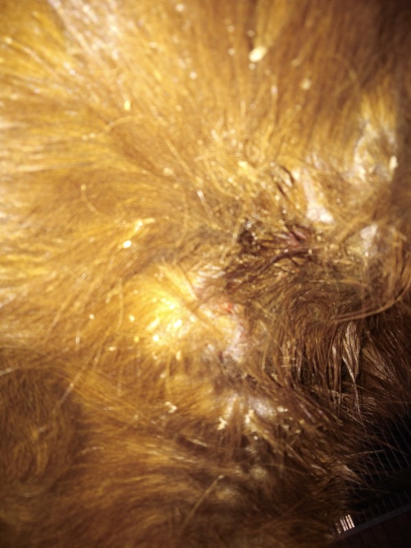 Ca me fait penser à une dermatophilose, non? Par contre, je ne sais plus comment je l'avais traitée...