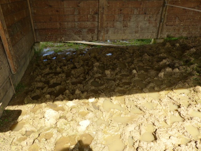 Pas eu les moyens de remblayer ou faire des travaux depuis vu qu'il y a toujours d'autres priorités, voilà l'état de mes abris au printemps sachant que les chevaux sont rentrés de début janvier à courant mars donc le sol n'est pas piétiné au pire de l'hiver.