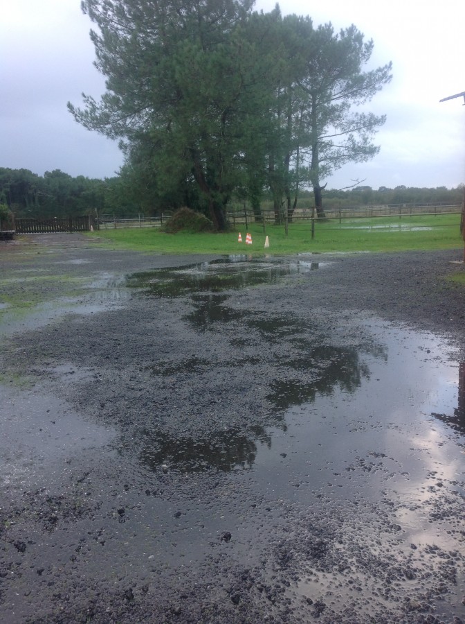 Ben voilà , depuis le 1er nov on en est à 200mm d'eau , le sol pompe plus du tout , cet abri est sur un terrain en légère pente , et bien tout l'hiver dernier c'est resté nickel , mais là l'eau ruissele en surface ( et pourtant le terrain est drainé !) ca y est en 1 weekend c'est gadoue , tout est trempé ça car l'eau va dans l'abri et ma couche de copeaux à baissé au niveau du sol extérieur .