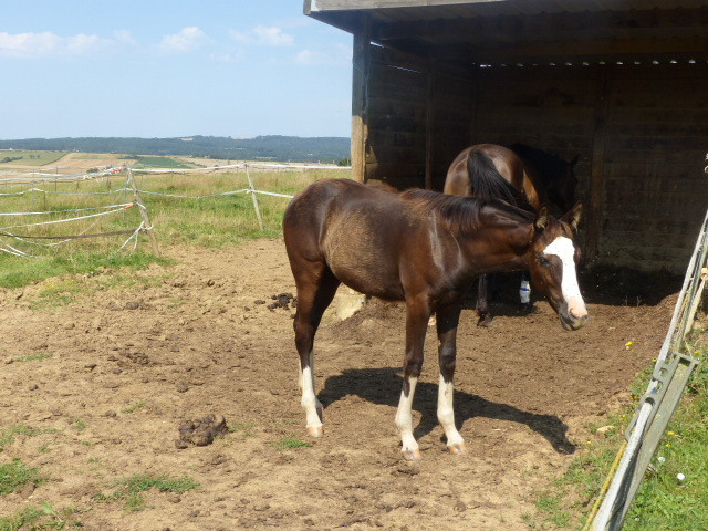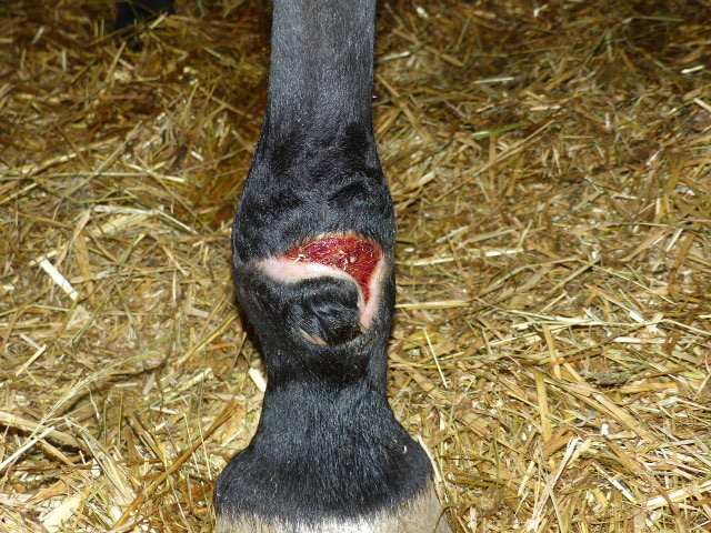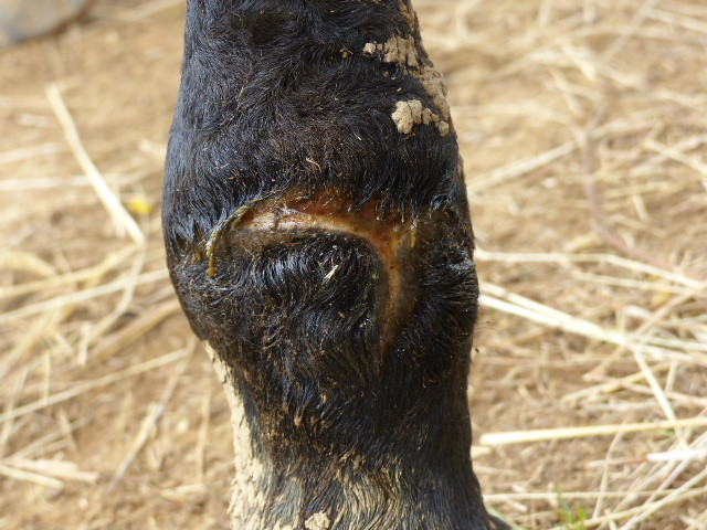 La gale de boue de sa mère a récidivé avec les pluies incessantes fin mai, pour cela que son boulet regonflait... Je l'ai trouvée en sang en nourrissant vite fait un dimanche matin avant d'aller en concours, bien évidemment: la peau avait recraqué...