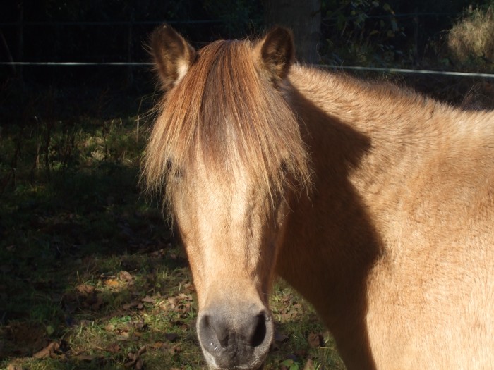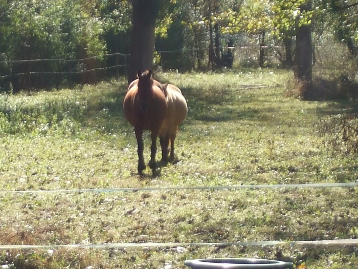 sinon, je reviens du pré pour voir si poulichette s'acclimate. alors aucun soucis, même s'il est difficile de l'approcher pour la gratouiller... mais bon, avec 3 passages par jour, dont deux avec ration, ça devrais vite rentrer dans l'ordre!