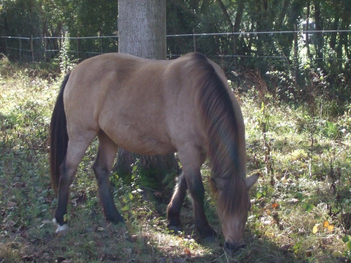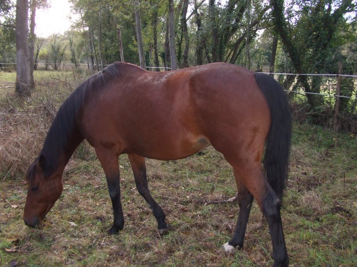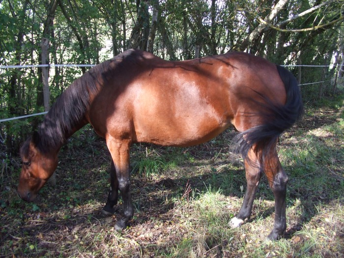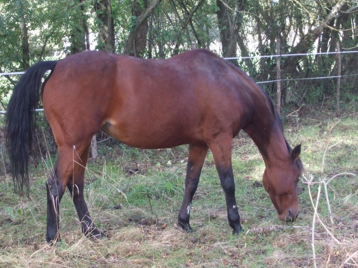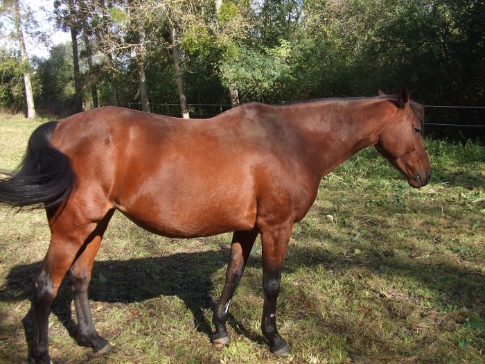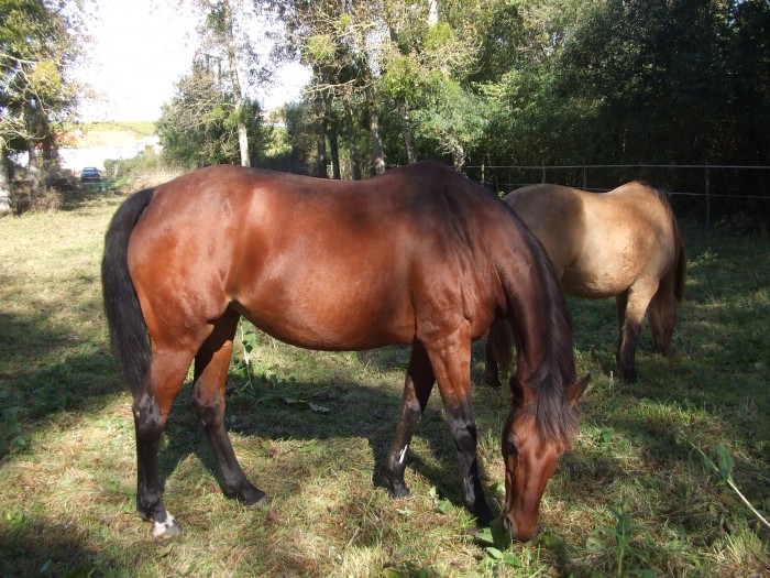 - ALFA SF par Poor Boy x Enchanteur AA, 15 ans, 1m63, dite JUNIOR puisqu'elle a le même nom que sa mère. Testée saine à la PSSM.