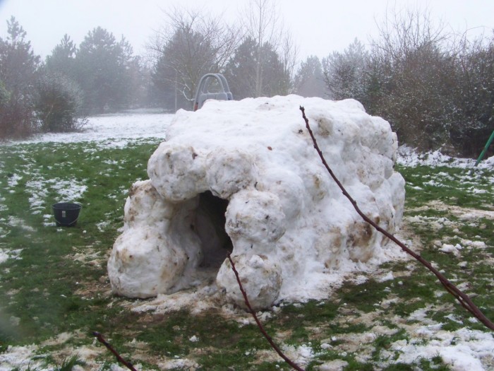 Le toit de l'igloo que les enfants ont fait hier s'est écroulé cette nuit, mais il y a encore un peu de neige ailleurs, il devrait en retomber, mais toujours rien pour l'instant, ouf!