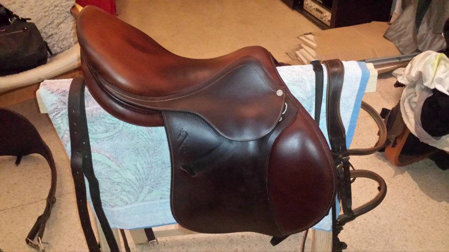 Et une nouvelle selle, une Nelson Pessoa en cuir havane taille 17 pour 40€ pc, après un bon coup de baume Effax, elle est très jolie, je l'ai testé hier en saut, elle est top malgré son âge, le siège plat est idéal pour moi, ses petits quartiers parfait pour mes petites pattes, on a juste sauté un vertical de 65-70 cm dans tous les sens possible (entrainement de base pour les barrages) et franchement, top position, le saut devient facile