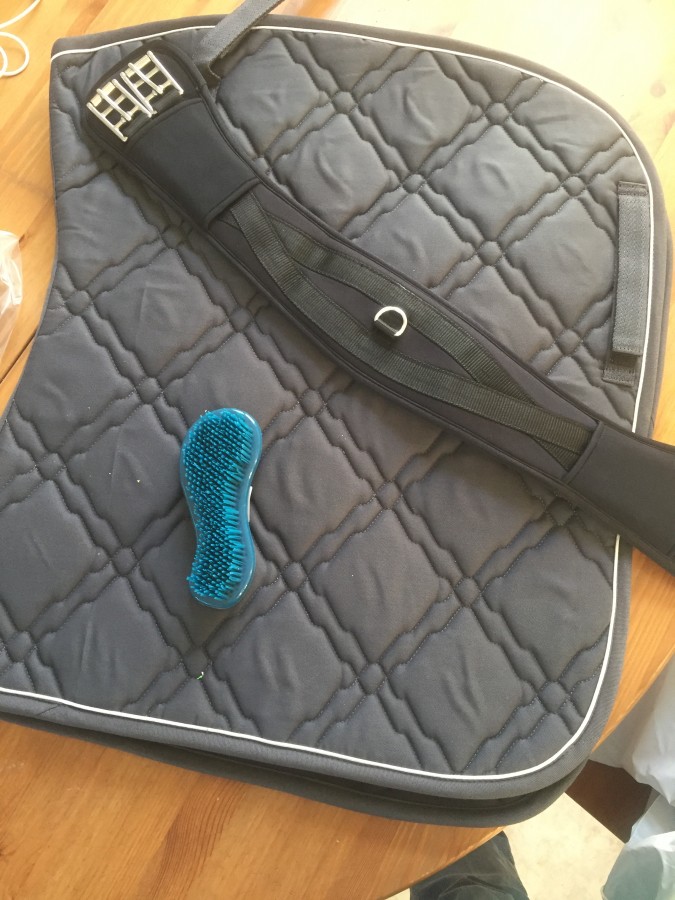 Chez Esprit Equitation : un tapis de dressage gris foncé à 20€ (trop fan de la couleur c'est exactement ce que je voulais !) à un super tarif et une sangle demi-lune à mémoire de forme à 40€ qui a l'air bien moelleuse.