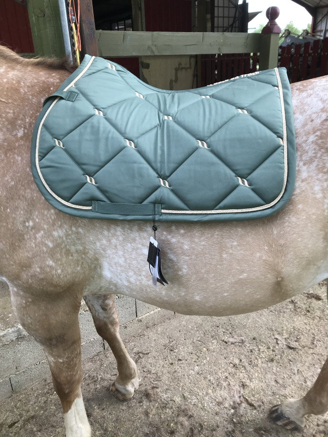 Voilà, j’ai craqué,j’ai pris un ensemble Back on Track tapis et bonnet, couleur olive. Bon, je l’ai acheté de seconde main, mais super affaire, 0 marques 0 taches 0 défauts 0 poils , en fait tout est neuf sous étiquette.