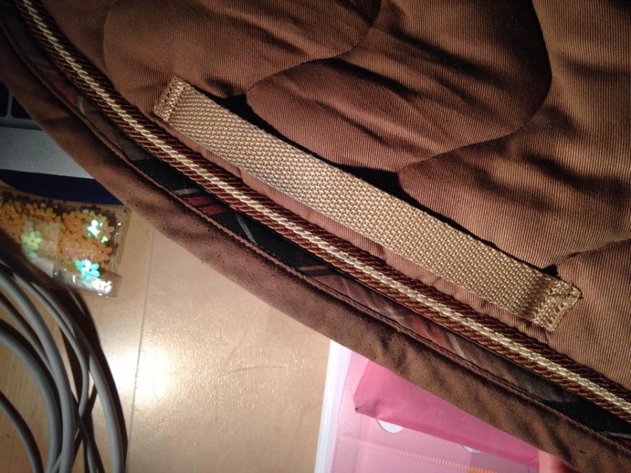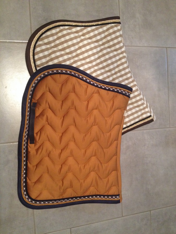 - Bonnet sur mesure chez Équi'dées, bleu marine, bord blanc et galon cuir vernis noir, assorti à mon Paddock pour les concours, plus long derrière pour être maintenu en place par le bridon Dyon. Bonnet toujours en cours de fabrication, mais au vu des photos de son travail, un beau bonnet de qualité et personnalisable à 100% pour seulement 27€ ! (Photo du tapis pour se donner une idée !)