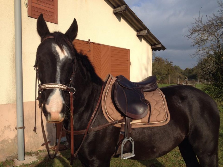 - Bridon Dyon Feel The difference à têtière décalée, en noir, trouvé d'occasion pour 120€ et en parfait état, pour libérer les cervicales sensibles de mon headshaker