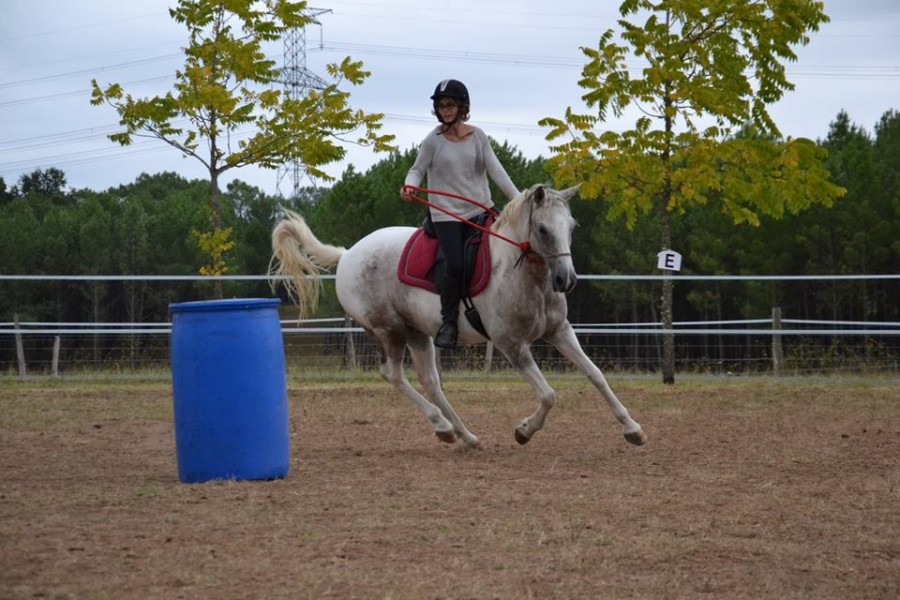 l'après-midi, travail monté type Parelli ! Donc on revoit les différentes actions de rênes: celle qui connecte les hanches, celle qui connecte les épaules. On travaille les départs au galop et on finit sur un jeu entre les barels, musique à fond, les chevaux ont adoré !