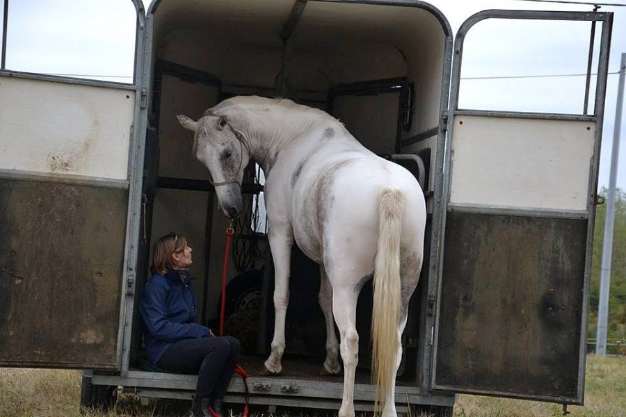 Et puis j'avais demandé à travailler sur l'embarquement en van. Ca fait plusieurs fois que Tulsa est capricieux pour monter. Donc j'ai travaillé à part sur cet exercice. Une fois les antérieurs posés dans le van, bien se détendre, se relâcher, sourire, s'asseoir. Essayer d'en faire une zone de confort. Au bout de quelques tentatives, Tulsa est monté comme un grand! :)