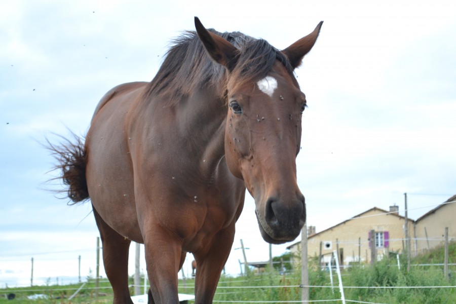 On faisait séance de saut, Poney savait qu'il avait les guêtres et donc il était pas mal excité. Difficile de l'avoir aussi bien a la détente que d'habitude mais bon. Très "excité" dès le premier saut, il essayait de prendre la main un peu. Bon enfin on remet en ordre, on le calme. Je viens sur le deuxième obstacle les mains bien hautes, très soutenu, pour l'empêcher de se mettre sur les épaules et s'avachir. Ça fini par venir et il se cale bien, un bon rythme comme il nous faut mais tout a fait contrôlable et bien équilibré.