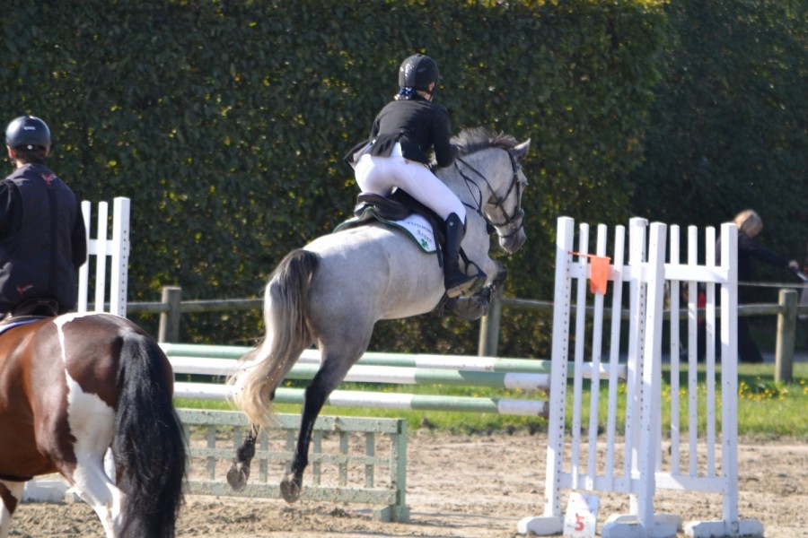 Prépa 95cm, je suis très vigilante et il file droit. On fait un bon parcours, mais la barre du dernier obstacle tombe (vertical, on était un peu à plat dessus, il aurait fallu que je le redresse et qu'il prenne de la hauteur...) J'avais eu peur sur l'avant dernier (le jaune et rouge) en ayant senti l'épaule droite s'appuyer sur la rêne droite pour s'échapper. Mais bon, bien plus positif que le tour précédent.