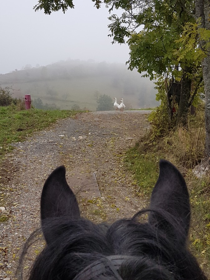 J'ai ensuite fait une pause avant de trotter un peu sur des cercles et changements d'incurvation (et ne pas avoir peur de son ombre). J'ai dû me fâcher à plusieurs reprises car il ne répondait pas du tout à la jambe