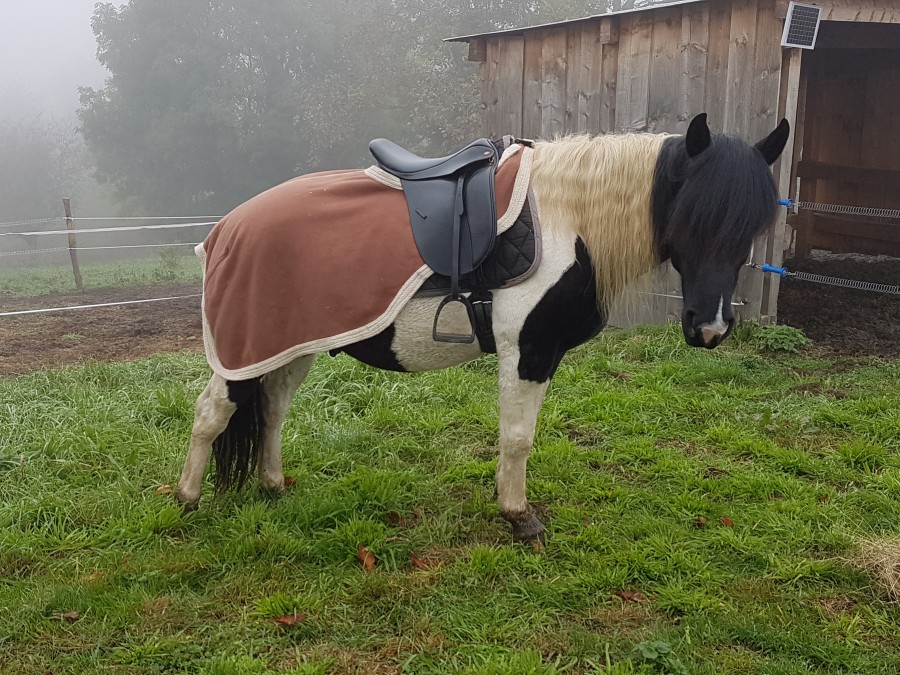 Vendredi on a fait un peu de plat, il était demandeur de travailler en extension donc je l'ai laissé faire. J'ai fini la séance en le laissant rênes longue et en essayant de le déplacer dans la carrière sans utiliser les rênes. Au trot, c'était top ! Il tournait vraiment bien, mais au galop c'était moins précis et il essayait de m'emmener vers les obstacles