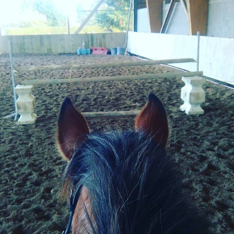 hier on a fait un peu de barres au sol et un travail sur une croix. Charlie a été super, et ce malgré d'autres chevaux dans la carrière, qui sont partis au bout d'un moment en plus ! bon la première croix j'ai pris un beau taxi parce qu'il a sauté hyper fort la deuxième fois c'était mieux, et la troisième c'était parfait ! j'ai travaillé au galop avant pour l'avoir bien, du coup quand je suis allée sauter il s'y attendait pas, il a pas eu le temps de chauffer et il a super bien sauté. j'ai laissé là-dessus. il est super agréable en ce moment depuis les nouvelles pistes de travail. et pour couronner le tout j'avais bien moins la sensation de tirer.