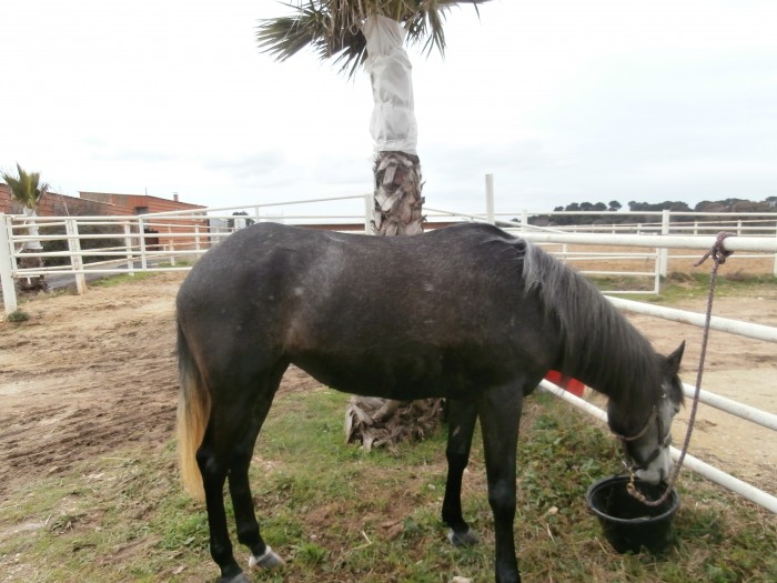 On a poursuivi les cessions à la jambe ainsi que le travail tête au mur, et on a introduit les hanches en dehors. On a également travaillé le départ au galop et on a revu le reculé.