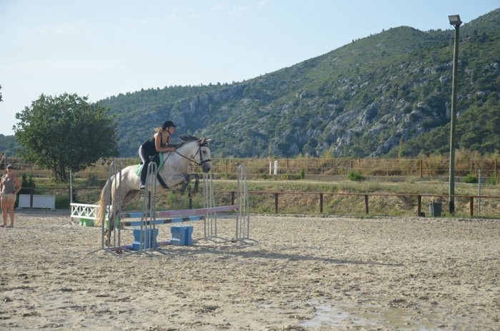-Suis plus le saut avec tes mains , tu es crispée puisque tu ne suis pas assez ton cheval est bloqué au niveau de l'encolure , il ne peut pas venir s'étendre correctement dans son saut .