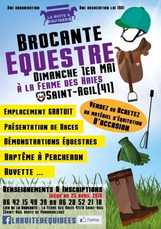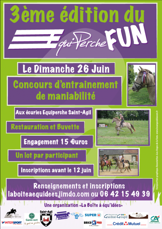 Le dimanche 26 juin se déroulera notre troisième édition du concours d'entrainement de maniabilité "l'Equiperche Fun" à Saint-Agil aux écuries Equiperche. Ce concours est organisé par l'association "La boîte à équ'idées" avec la participation de l'EARL Equiperche.