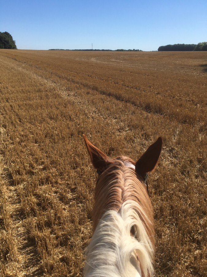 ! On part gaillardes ! Arrivées au croisement, je la laisse choisir: pour elle, ce sera la plaine et les chaumes. Ok. Pas, trot, galop dans les chaumes, que du bonheur . Au retour, un chevreuil est tout seul dans les chaumes en train de brouter...ah ben non en fait, ils sont deux qui nous observent " tiens, t'as vu, il y a une vache en liberté"