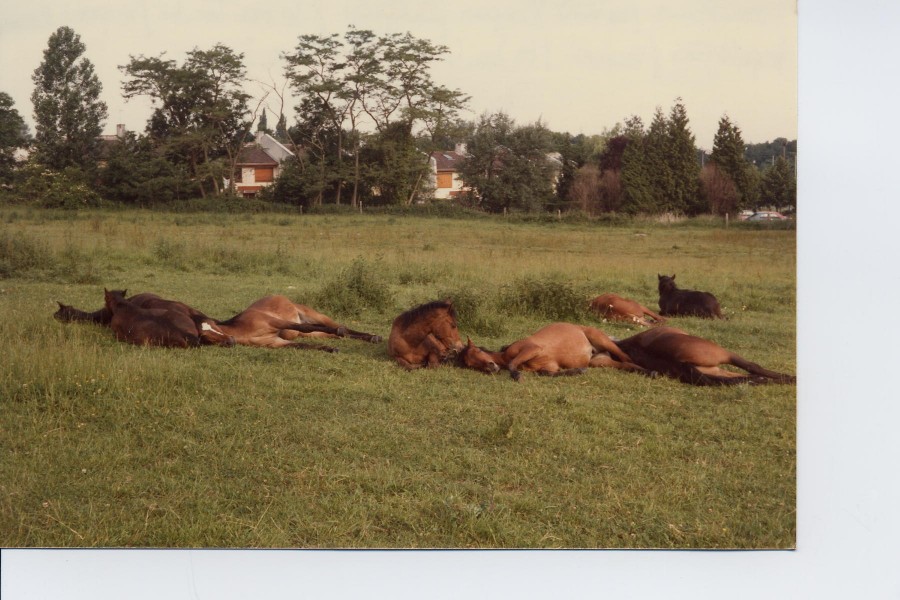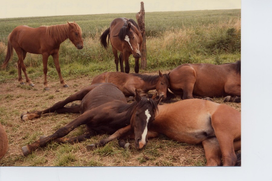 photo qui était avec les suivantes...que je ne propose pas mais que je vous colle quand même, parce que...après tout, elles ont un certain âge (idem 1985), du temps où les "S" dormaient en tas, tas de "S", avec juste un "R" dedans...petits poulains en devenir d'adultes au destin parfois fabuleux, parfois arrêté trop tôt...dans ce tas il y en aura un qui partira à 5 ans, et un autre qui fera des championnat d'Europe et qui donnera son nom au centre équestre de sa future proprio...