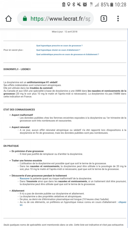 Voici ce que dit le crat. À savoir que c'est la référence à laquelle il faut se fier pendant la grossesse et l'allaitement. Les notices de médicament et Vidal ne sont pas au point. Quand tu veux savoir si tu peux prendre un médicament enceinte tu tapes dans Google "nom du médicament + le crat".