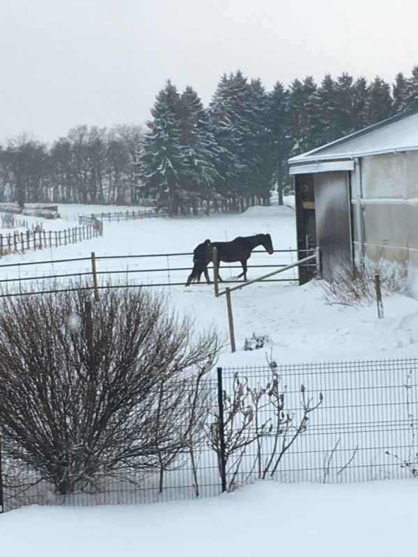 Retour à l'écurie, on discute avec d'autres cavaliers, et soudain un énorme bruit sec, comme un coup de feu. Les chevaux à l'attache ont tous sauté en l'air, Poupette a arraché sa longe de trouille - elle a de la force...
