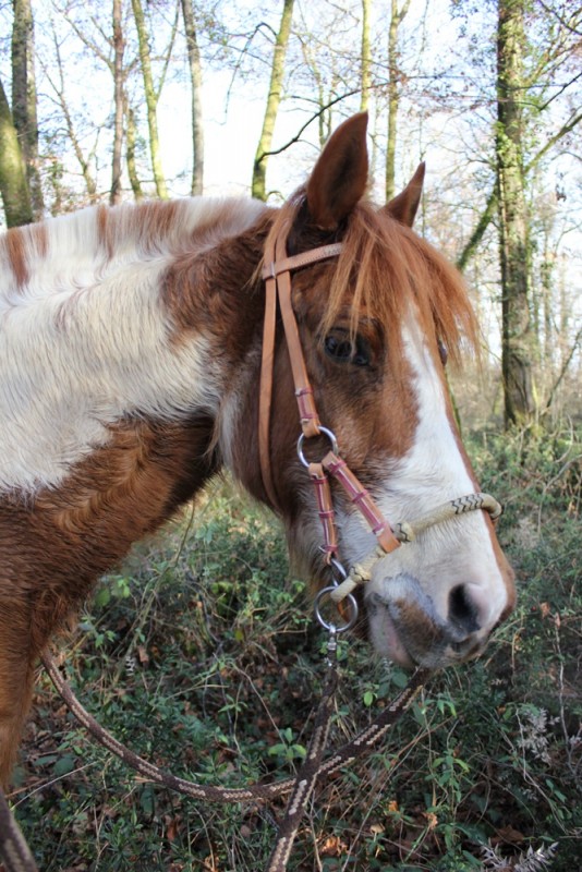 loulou commence à bien apprivoiser ces nouveaux lieux, j'ai eu une micro pause devant le chien qui faisait peur au tout début, puis je l'ai engagé sur un petit chemin qui serpente dans les bois, on l'avait pris une seule fois dans l'autre sens. Ce chemin est sympa car bien étroit et avec des branches basses (enfin, sur un poney ça doit passer mieux mais le rouquin fait 1m60, moi 1m75 donc là faut ouvrir les yeux et se coucher régulièrement) ça fait un peu maniabilité. Là dans le sens de la descente qui plus est, Velours marchait assez vite, mais il a quand même accepté de faire une pause le temps que je prenne une photo dudit sentier (ça rend pas, faudrait filmer ; j'adore mon cornichon qui tourne la tête "pourquoi on s'arrête...?")