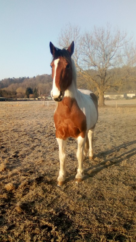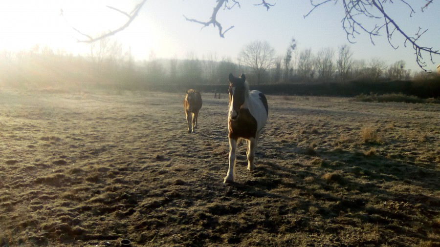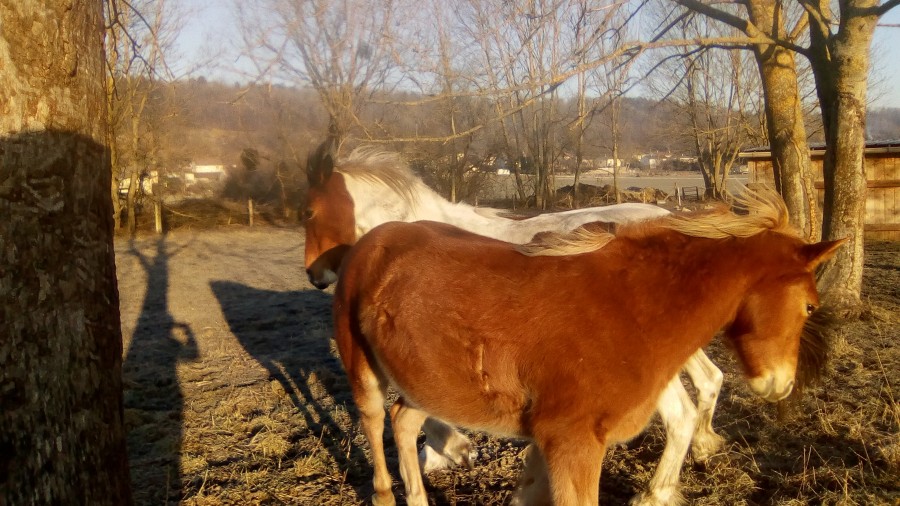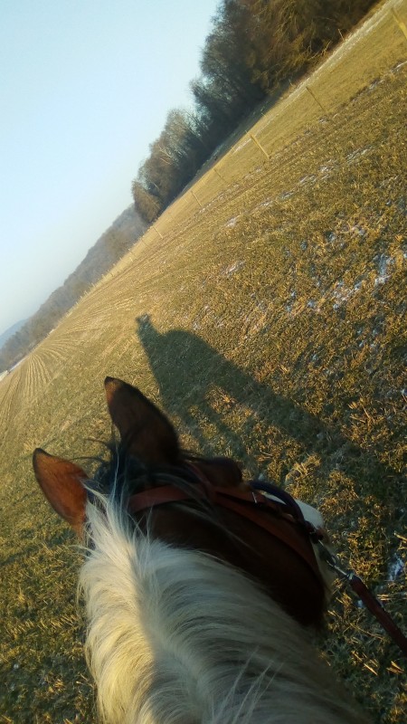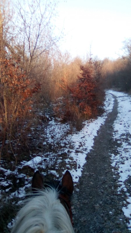 Et soit des caillasses, soit du chemin qui glisse. Parfois je mettais loulou au trot pour passer plus vite sur les cailloux, parfois ça glissait tellement qu'il m'inventait une allure inconnue, hop on repasse vite au pas.