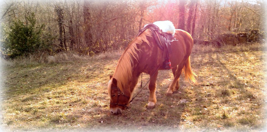 Apres un gros orage cette nuit , je me lève sous le soleil . Youpi , direction poney , Ca ne va pas durer .