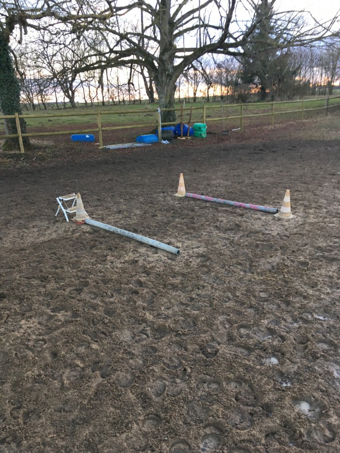 Nous devions travailler sur des barres au sol mais je n'arrivais pas à garder Chicane droite et donc je le bloquais. Et j'étais obstinée à vouloir qu'elle soit droite avant de faire l'exo...du coup j'étais butée, fermée et en colère. Et en fait nous étions quatre cavalières et nous avions toutes un problème à régler et quelque chose qui fait que nous étions énervées.