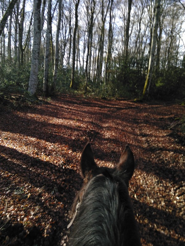 Arrivé en bordure du bois je décide de monter sauf que le montoir laisse toujours à désirer mais grâce à une butte j'arrive enfin à monter. On démarre et à la première intersection quiz pile. On redémarre le cheval avance, oreilles bien en avant, du coup on trotte jusqu'à la sortie du bois, mon loulou est nickel avec un petit trot