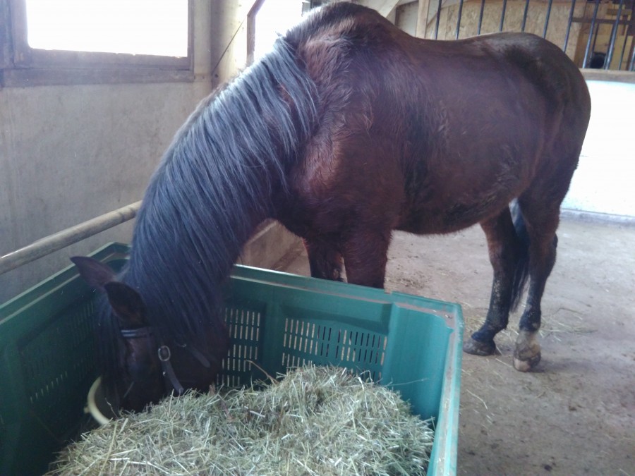 Noa Daineger, cheval français de selle de 2001, atteint d'un cushing. (la bai sur les photos).